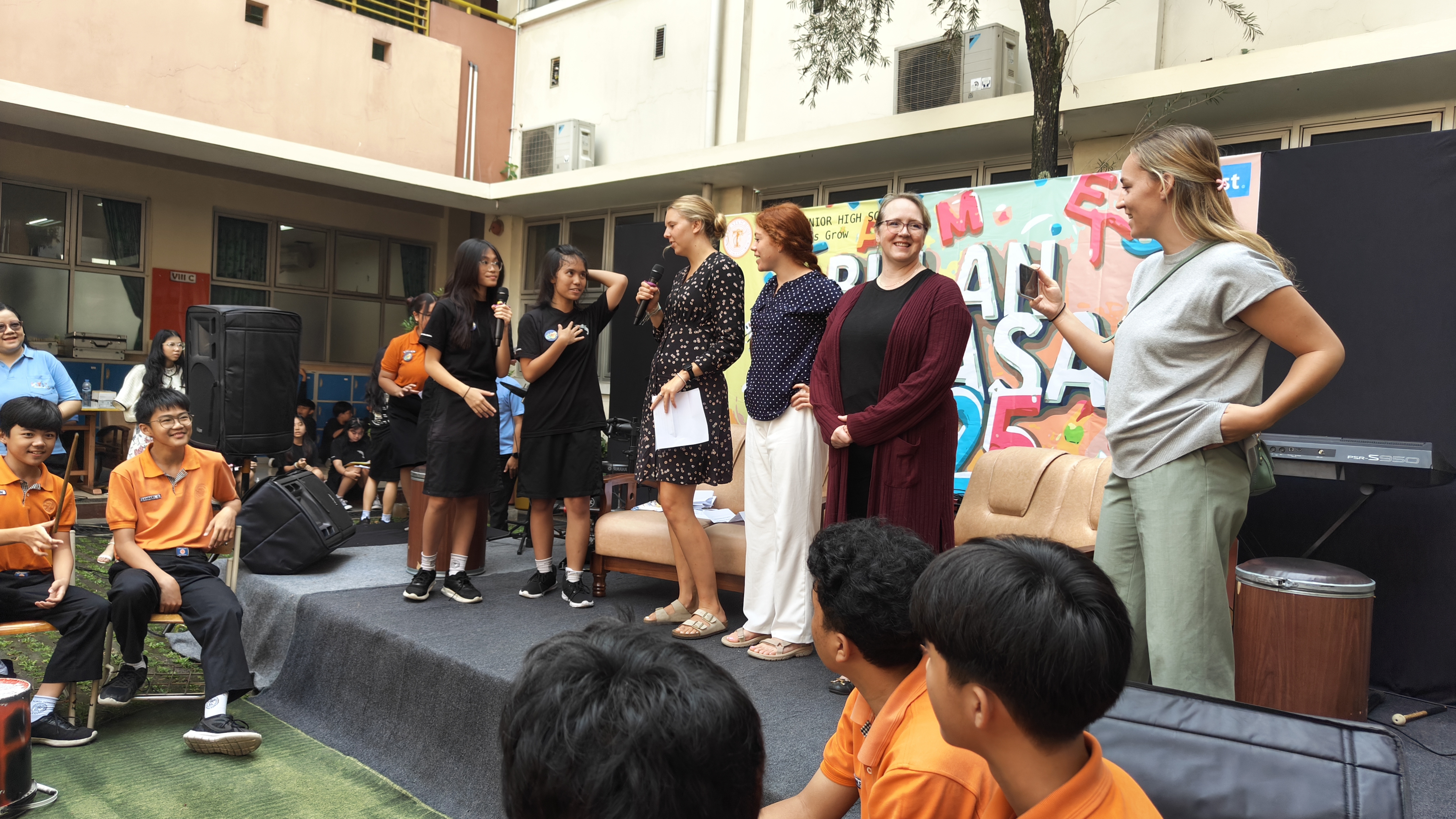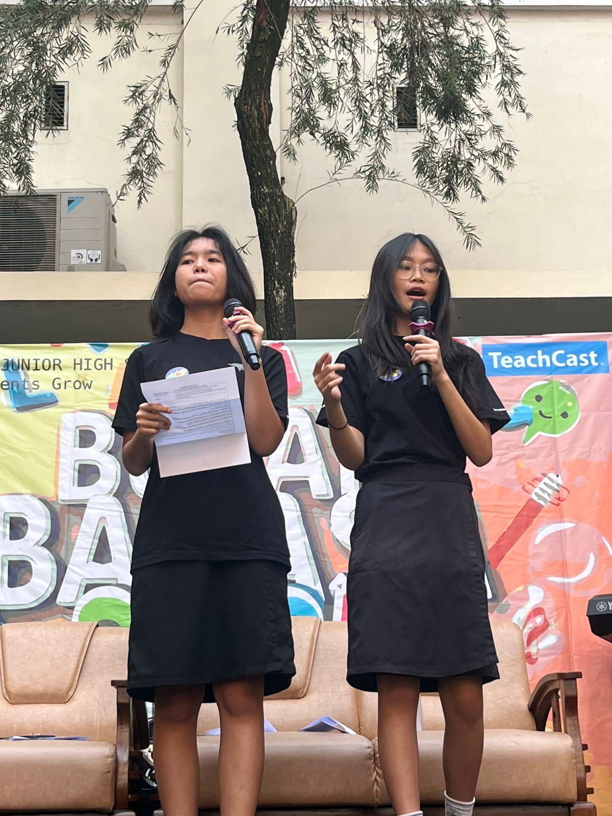 Adding to the excitement, the event was attended by native speakers from Teach Cast. Jeanna, Kyle, Kelly, and Jessica, who helped present questions during the final round. A special Talk Show was also held, where the native speakers shared insights about the differences between teenage life in America and Indonesia. Students who asked thoughtful questions received fun prizes as rewards.