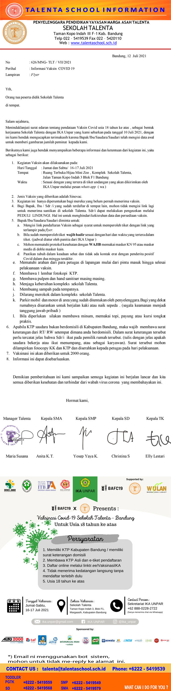 Menindaklanjuti surat edaran tentang pendataan Vaksin Covid usia 18 tahun ke atas , sebagai bentuk kerjasama Sekolah Talenta dengan IKA Unpar yang kami sebarkan pada tanggal 10 Juli 2021, dengan ini kami hendak mengucapkan terimakasih karena Bapak/Ibu/Saudara/Saudari telah mengisi data awal untuk memberi gambaran jumlah peminat kepada kami.