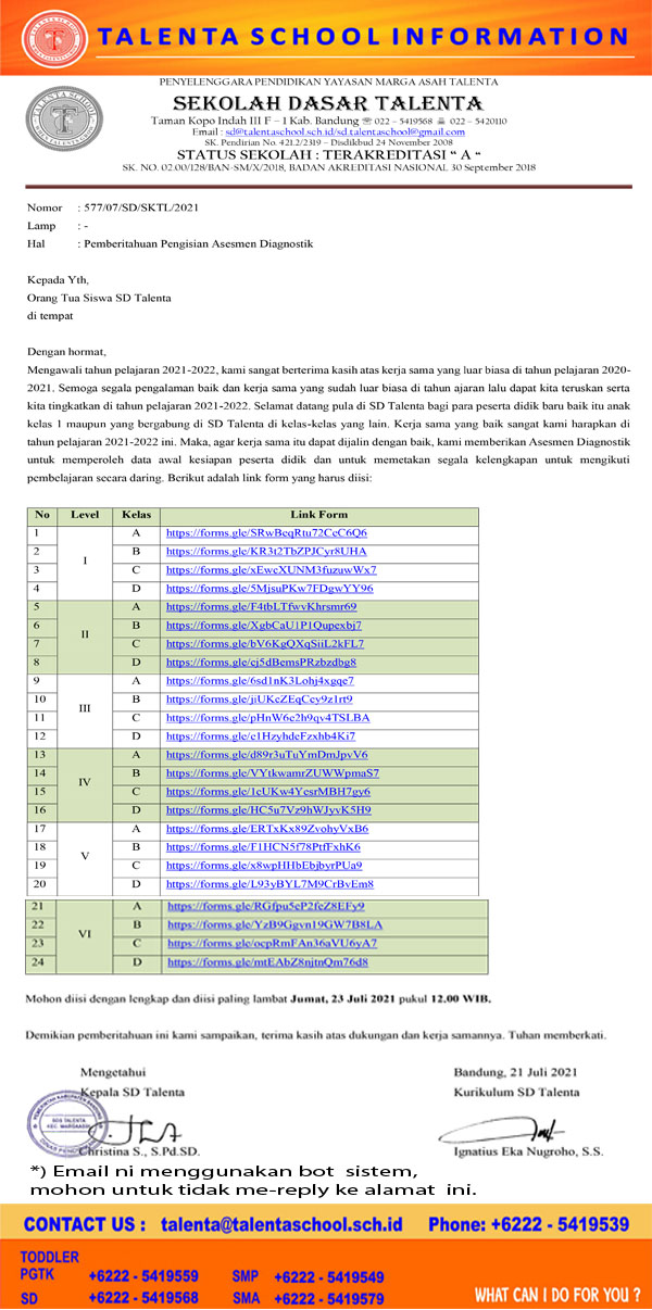 Mengawali tahun pelajaran 2021-2022, kami sangat berterima kasih atas kerja sama yang luar biasa di tahun pelajaran 2020-2021. Semoga segala pengalaman baik dan kerja sama yang sudah luar biasa di tahun ajaran lalu dapat kita teruskan serta kita tingkatkan di tahun pelajaran 2021-2022. Selamat datang pula di SD Talenta bagi para peserta didik baru baik itu anak kelas 1 maupun yang bergabung di SD Talenta di kelas-kelas yang lain. Kerja sama yang baik sangat kami harapkan di tahun pelajaran 2021-2022 ini. Maka, agar kerja sama itu dapat dijalin dengan baik, kami memberikan Asesmen Diagnostik untuk memperoleh data awal kesiapan peserta didik dan untuk memetakan segala kelengkapan untuk mengikuti pembelajaran secara daring. Berikut adalah link form yang harus diisi: