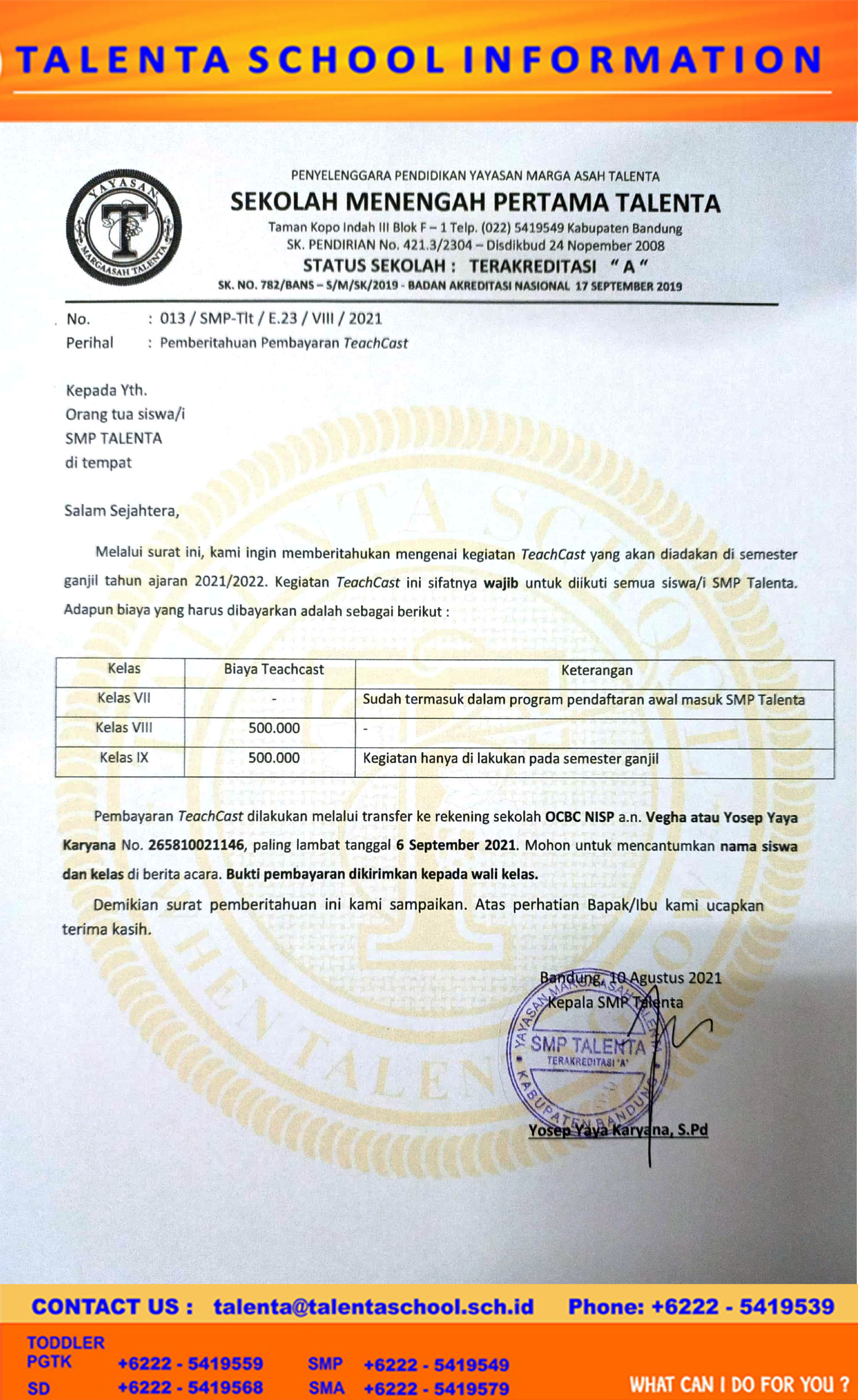 Pembayaran TeachCast dilakukan melalui transfer ke rekening sekolah OCBC NISP a.n. Vegha atau Yosep Yaya Karyana No. 265810021146, paling lambat tanggal 6 September 2021. Mohon untuk mencantumkan nama siswa dan kelas di berita acara. Bukti pembayaran dikirimkan kepada wali kelas.