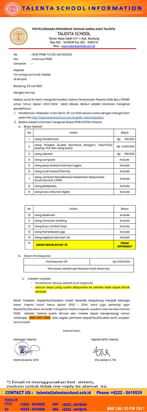 Besar harapan, Bapak/Ibu/Saudara masih bersedia bergabung menjadi keluarga besar Talenta untuk Tahun Ajaran 2023 - 2024. Kami juga berharap agar Bapak/Ibu/Saudara bersedia menginformasikan kepada saudara atau kenalan bahwa PPDB Sekolah Talenta sudah dimulai dan mereka dapat menghubungi nomor whatsapp 0823-2157-2085. Atas segala perhatian Bapak/Ibu/Saudara kami ucapkan terima kasih.