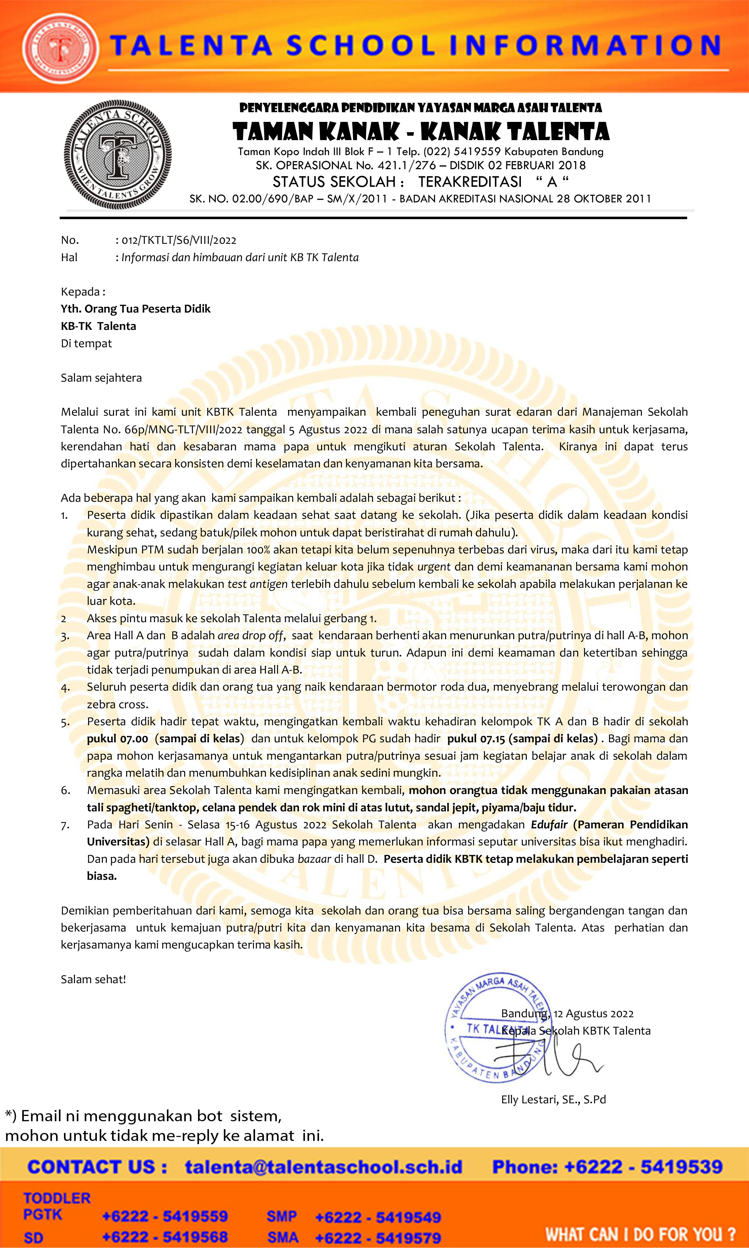 Melalui surat ini kami unit KBTK Talenta menyampaikan kembali peneguhan surat edaran dari Manajeman Sekolah Talenta No. 66p/MNG-TLT/VIII/2022 tanggal 5 Agustus 2022 di mana salah satunya ucapan terima kasih untuk kerjasama, kerendahan hati dan kesabaran mama papa untuk mengikuti aturan Sekolah Talenta. Kiranya ini dapat terus dipertahankan secara konsisten demi keselamatan dan kenyamanan kita bersama.