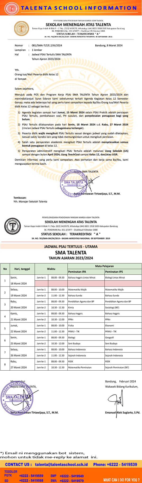 Merujuk pada POS dan program kerja PSAJ SMA TALENTA Tahun Ajaran 2023/2024 dan menindaklanjuti Surat Edaran kami sebelumnya terkait Agenda kegiatan kelas 12 Semester Genap, maka ada beberapa hal yang perlu kami sampaikan kepada Bp/Ibu Orang tua /Wali Peserta didik kelas 12 sebagai berikut :