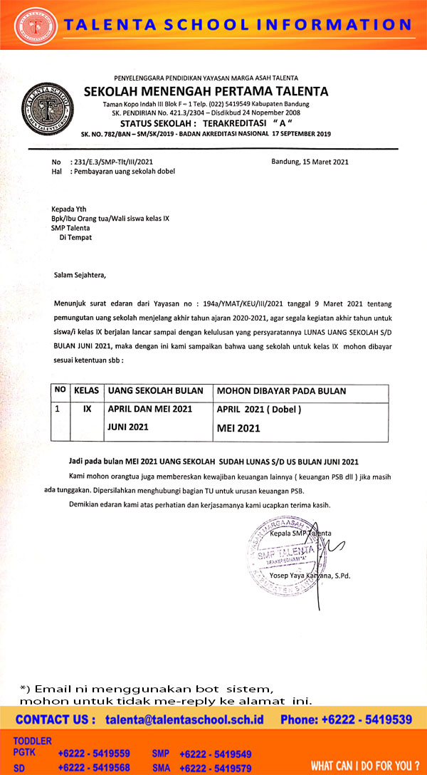 Menunjuk surat edaran dari Yayasan no : 194a/YMAT/KEU/lll/2021 tanggal 9 Maret 2021 tentang pemungutan uang sekolah menjelang akhir tahun ajaran 2020-2021, agar segala kegiatan akhir tahun untuk siswa/i kelas IX berjalan lancar sampai dengan kelulusan yang persyaratannya LUNAS UANG SEKOLAH S/D BULAN JUNI 2021, maka dengan ini kami sampaikan bahwa uang sekolah untuk kelas IX mohon dibayar sesuai ketentuan sbb :