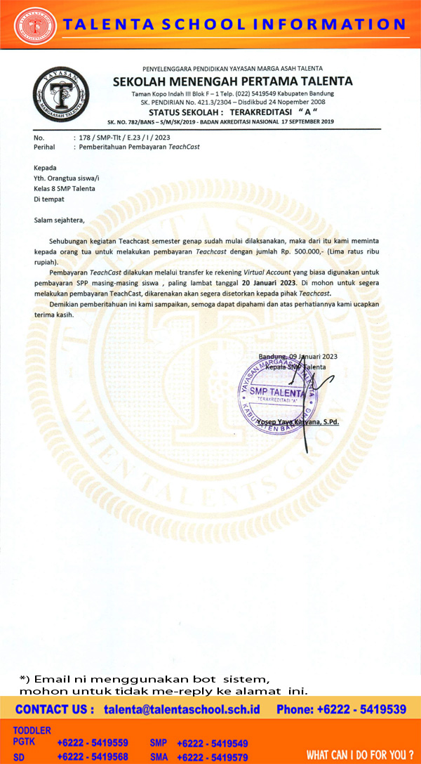 Pembayaran TeachCast dilakukan melalui transfer ke rekening Virtual Account yang biasa digunakan untuk pembayaran SPP masing-masing siswa , paling lambat tanggal 20 Januari 2023. Di mohon untuk segera melakukan pembayaran TeachCast, dikarenakan akan segera disetorkan kepada pihak Teachcast.